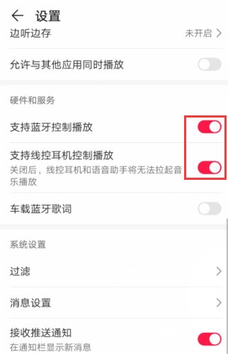 二、找到“支持蓝牙控制播放”和“支持线控耳机控制播放”这两个选项,关闭这两个选项即可解决。