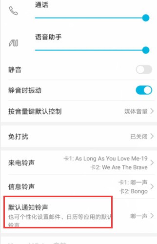 四、向下翻,找到“默认通知铃声”并点击打开该项。