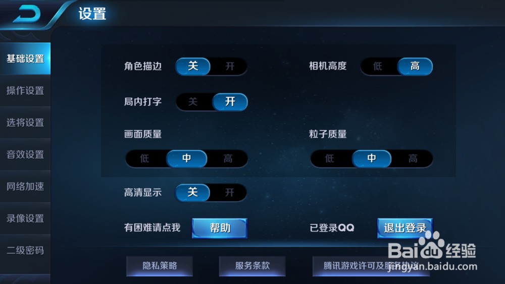 2.首先点开基础设置,可以设置局内打字、画面质量、粒子质量等等,可以根据个人的手机情况和喜好设置。