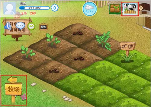 1、进入QQ农场,在农场的左下方有一块标明“牧场”的牌子或者农场右上方QQ牧场的标志,点击后即可开通QQ牧场。如图: