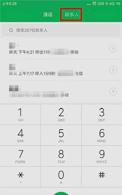 2、在通话界面上方有【通话】和【联系人】两个选项,点击【联系人】。