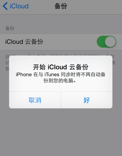 向左拖拽勾选操作后,系统自动弹出“开始iCloud云备份”的询问框,并说明了使用手机进行iPhone云备份的一些弊端,建议用户应该充分了解!如果确认自己可以接受的话就点击询问框上的“好”按钮吧。