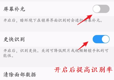 6、识别完成后,在面部解锁的设置页面还可以勾选“屏幕补光”和“更快识别”这两项辅助功能,这样借助vivo nex的强大前置摄像头,可以让人脸识别解锁成功率大大提高。
