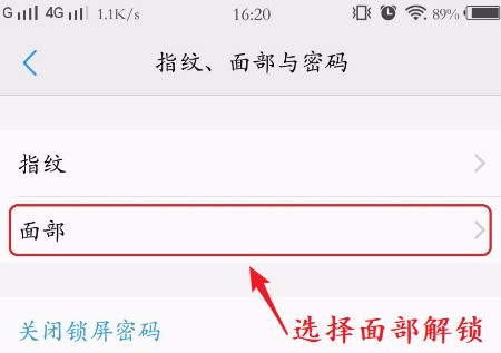 3、在解锁方式的选择页面中,选择“面部”解锁方式进行配置。