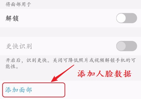 4、进入面部解锁管理页面后,点击页面中的“添加面部”这一选项。