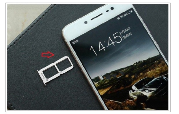 1、首先将vivo Y66手机关机; 2、取出包装盒中的卡针,用卡针顶一下机身左侧SIM卡槽边上的小孔,这样卡槽就会弹出,然后将机身左侧的SIM卡槽取出,如下图所示。