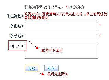 4,此时弹出添加音乐对话框,第一项歌曲链接添写歌曲的下载地址即可(地址为mp3,wma结尾),歌首名和歌曲名可随便添写,最后一项可不填
