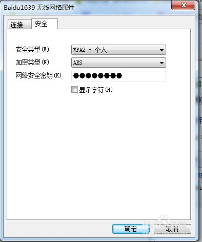 4、双击连接的无线网络;单击“安全”选项卡,单击显示字符这样就可以看到安全密钥了。