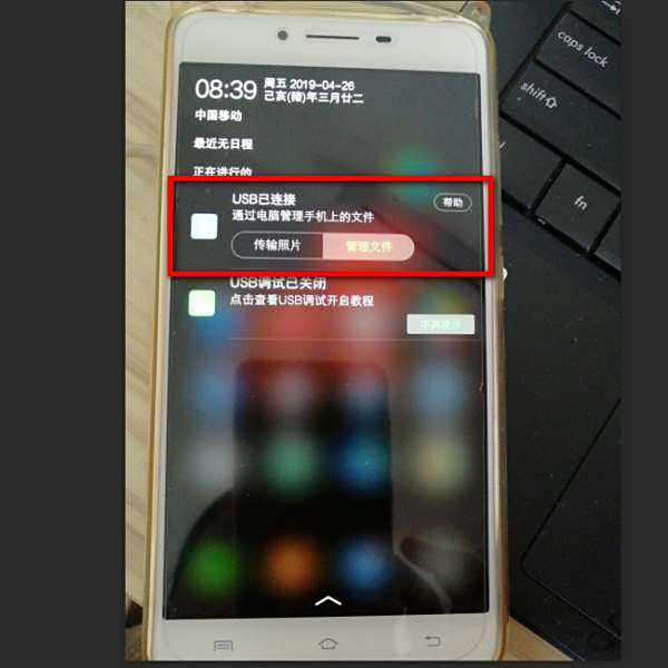 3、连接后,手机与电脑上都会出现提示,点击手机上的管理文件或传输照片。