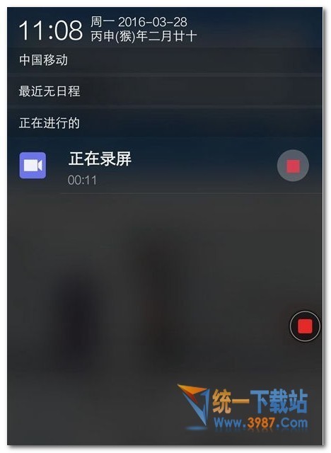 三、接下来我们在屏幕页面看到有一个红色点或者下拉屏幕调出通知栏即可看到红色按钮,点击一下即可停止录屏,如下图所示。