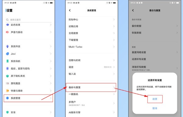 4、还原所有设置:可进入设置-系统管理/更多设置-备份与重置/恢复出厂设置-还原所有设置-还原,恢复设置选项。此操作不会删除文件或软件,会取消密码,还原所有的设置,包括:设置的壁纸、解锁样式、WiFi、默认开启程序等。注:进入云服务-设备云备份-备份数据类型-系统数据-返回-立即备份可备份部分系统设置和桌面布局;云服务-数据同步-打开WLAN、蓝牙等可将数据同步到云服务。