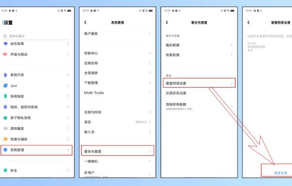 3、重置网络设置:将WLAN、移动数据网络、蓝牙等网络的连接记录删除,可进入设置-系统管理-备份与重置-重置网络设置-重置设置-按提示操作即可(双卡时需选择对应的SIM卡)。注:进入云服务-数据同步-打开WLAN、蓝牙等可将数据同步到云服务;进入“云服务”-设备云备份-备份数据类型-打开“系统数据”-返回上一个页面-立即备份,对部分系统设置数据进行备份。