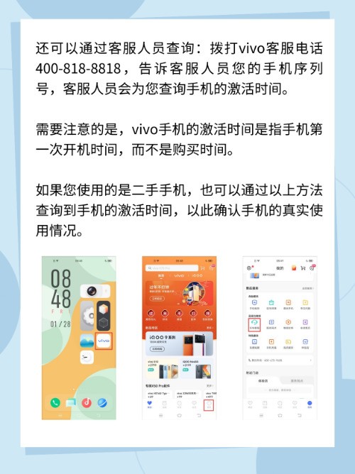 请注意:以上方法可能因手机型号和系统版本的不同而略有差异。如果以上方法无法查询到激活日期,建议直接联系vivo官方客服进行咨询,以获取最准确和最新的查询方式。