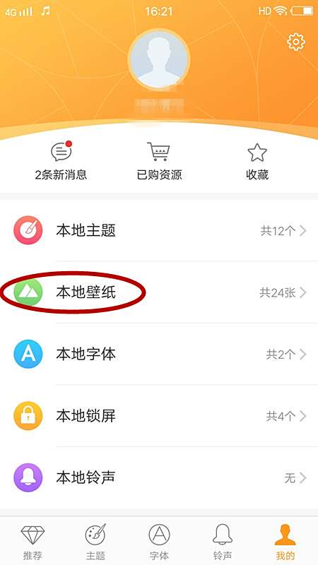 2、在主题界面,找到右下角的我选项,进入后选择本地壁纸,点击打开进入。
