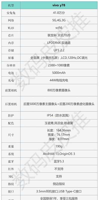 处理器:天玑7020(6nm制程工艺)内存:最高版本12GB+256GB大内存,支持内存融合3.0技术屏幕:护眼LCD屏,分辨率2388×1080,刷新率120Hz,支持4096级DC调光无频闪拍照:后置5000万像素超清主摄+200万像素虚化镜头,支持vivo超级夜景算法和多帧降噪算法电池续航:5000mAh大容量电池,支持44W闪充技术影音体验:第三代独家定制超级扬声器,支持200%超大音量外观设计:后盖拥有凤羽金、玉瓷青、暗夜黑三款配色,厚度8.07mm综上所述,vivo Y78在性能、内存、拍照、续航和影音体验等方面都有不错的表现,适合作为备用机或者对手机性能要求不高的人群使用。然而,在CPU性能、功能配置、屏幕色彩和防水等级等方面也存在一些不足,用户在购买前需要根据自己的需求和预算进行综合考虑。