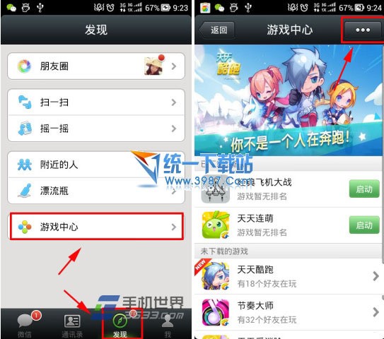 1)打开手机微信软件,点击“发现”界面之后,我们会看到一个“游戏中心”的360问答选项,这里我们就点击游戏中心,进入游戏中心后再点击右上角的“…”。(如下图所示)