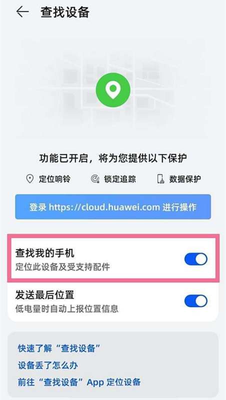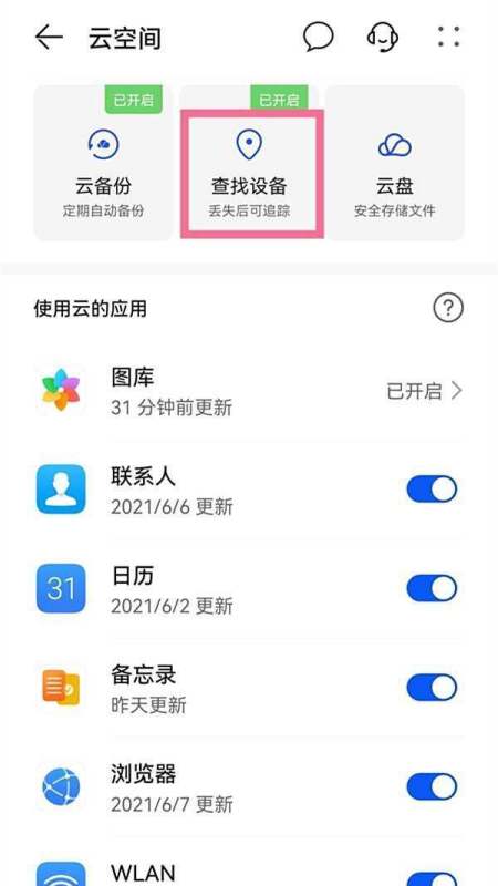 开启查找设备功能:进入云空间,点击【查找设备】,打开【查找我的手机】右侧的开关(此步骤为华为手机自身定位设置,vivo手机需在其系统中独立开启类似功能)。