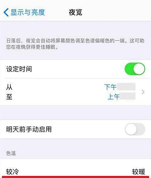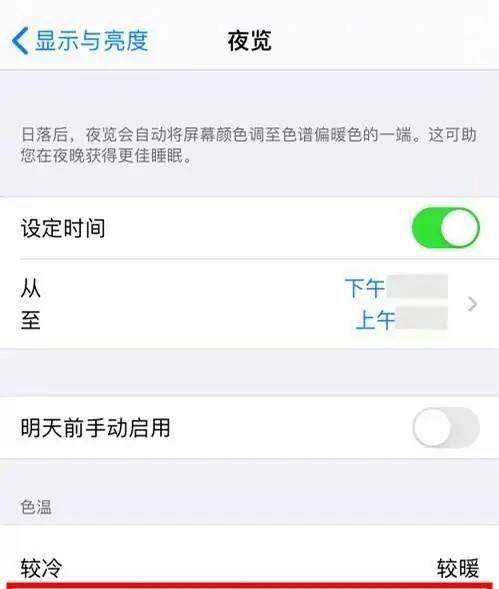 调节色温功能仅在【夜览】模式下生效,若未开启夜览,需先在【夜览】界面打开【设定时间】开关,或选择【明天前手动启用】,才能进行色温调节。色温调节效果因人而异,用户可根据自身视觉舒适度灵活调整,若调节后仍感觉不适,可尝试结合【原彩显示】功能(在【显示与亮度】界面开启),让屏幕根据环境光线自动调整色温。iPhone13调节屏幕色温的步骤如下: