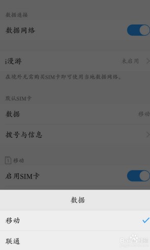 3、把“数据”下的移动,改为“联通”,其他卡也相应的改为相对应的即可。