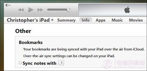 iTunes同样可以让你在电脑和iPad或iPhone之间做书签同步。iTunes处理同步的方式比较老套——当你将设备插上USB连接线时手动发起同步。要用到这个选项,首先将你的设备通过USB连接到电脑上,在iTunes中选择设备,然后点击信息(Info)选项。