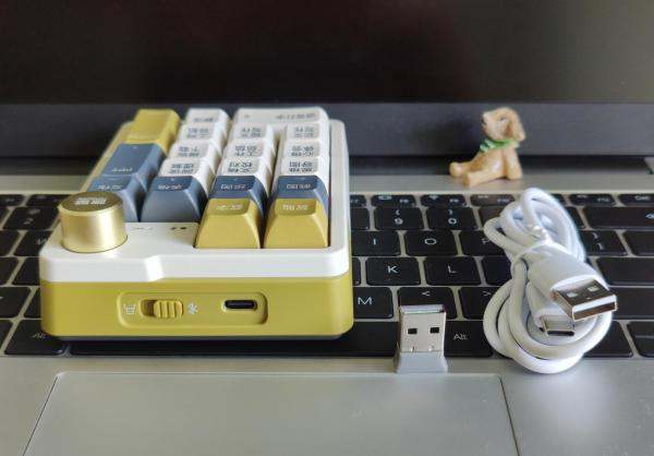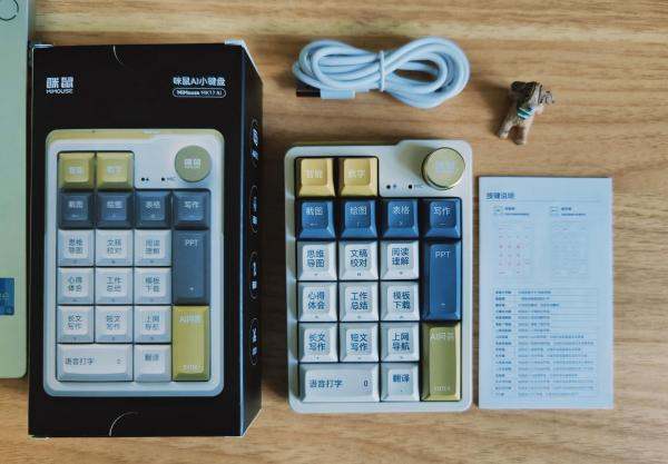 咪鼠小17AI键盘的包装简约而不失高端感,采用酷黑卡盒包装,内部配有高硬度卡纸衬托,有效保护键盘免受损坏。键盘主体采用白、黄和灰蓝色彩搭配,时尚简约又清新,非常适合现代办公环境。配件方面,除了键盘主体之外,还有一根USB-C连接线和说明书,简洁明了。