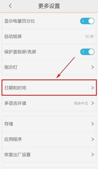 第三步;进入【更多设置】后向下滑动,选择【日期和时间】。