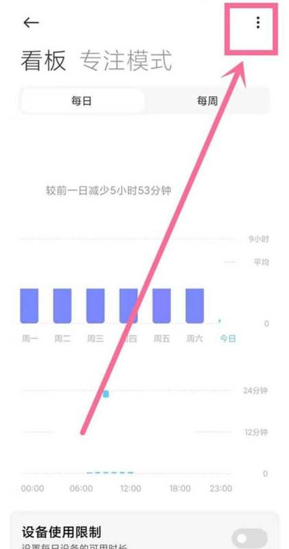 进入管理设置:进入屏幕时间管理页面后,点击右上角的三点图标,该图标通常用于唤出更多操作选项。