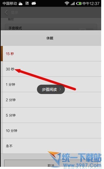4、确认之后我们就可以手机的休眠时间,具体的休眠时间可以根据自己的手机使用习惯,时间的长短直接决定手机的电量变化,因为屏幕大所以使用电量就快。