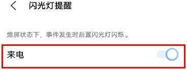 激活来电闪光灯:进入【闪光灯提醒】页面后,找到【来电】选项,将其右侧的开关滑动至开启状态(显示为蓝色或绿色)。