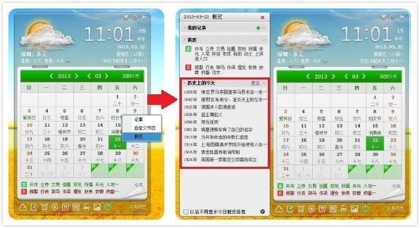 每天都是不同的,历史上的今天发生过什么的重大的事件呢?闲暇之余,让我们来看看,“今天”历史上有什么重大的事件吧!鼠标右击人生日历的日历格,选择“概览”,在日历的左侧栏,在这里就可以看到历史上今天发生过的重大事件了。