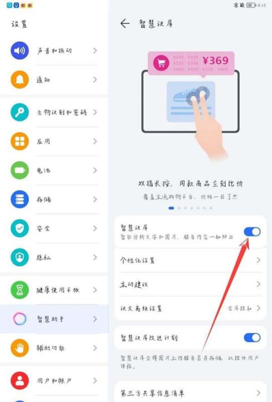 功能作用:开启后,用户可通过双指长按屏幕或指定手势,快速识别屏幕内容(如文字、图片、商品等),并支持翻译、搜索、分享等操作。兼容性:该功能基于安卓12.0系统开发,适用于realme真我GT大师版及后续升级机型。注意事项:若未找到Breeno选项,可尝试在设置顶部搜索栏输入“识屏”直接定位功能入口。华为MatePad Pro开启智慧识屏的步骤如下: