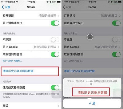 2.进入 Safari 浏览器设置后,点击底部的“清空历史数据与网站数据”,之后会弹出一个确认清空选项,继续点击底部的“清空历史记录与数据”就可以完成Safari缓存清理了,如下图所示。