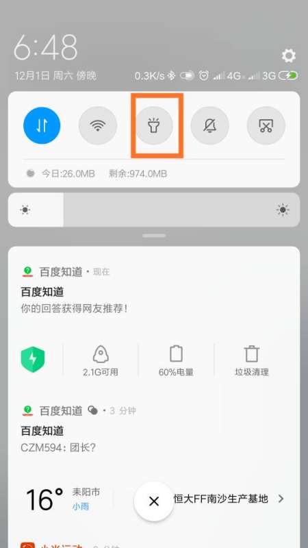 方法一:屏幕下拉后点一下电筒快捷键图标,如下图