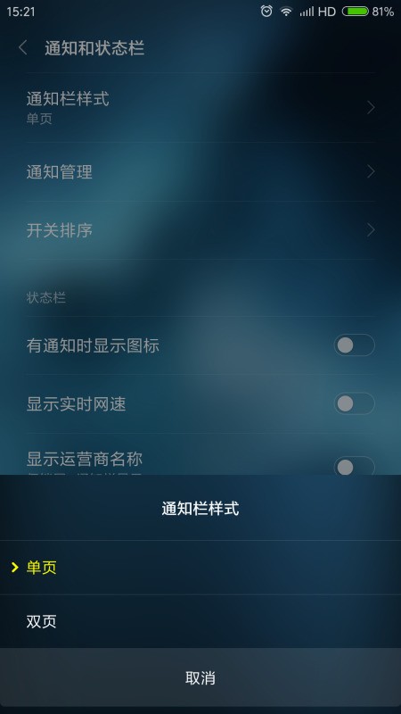 操作时需准确点击图标,避免误触导致调整失败。顶部11个快捷开关区域为通知栏固定显示位,超出部分的图标需通过管理界面调用。不同MIUI版本可能存在界面差异,但核心操作逻辑一致。小米手机通知栏只有单页和双页两种样式: