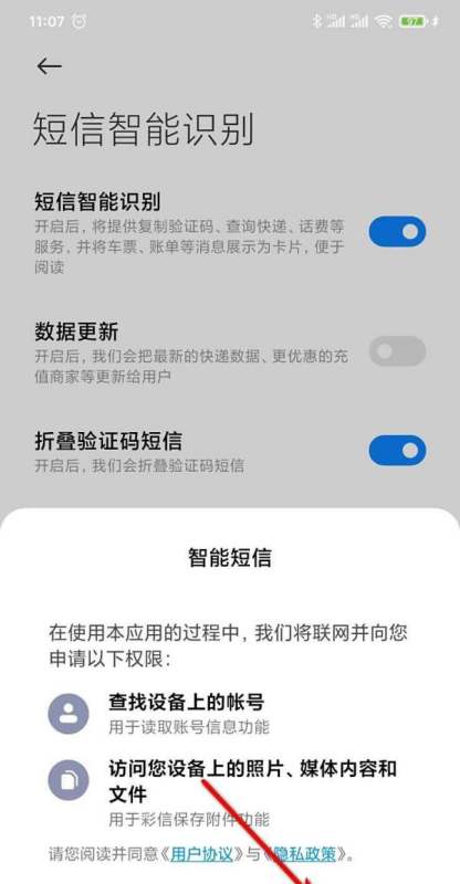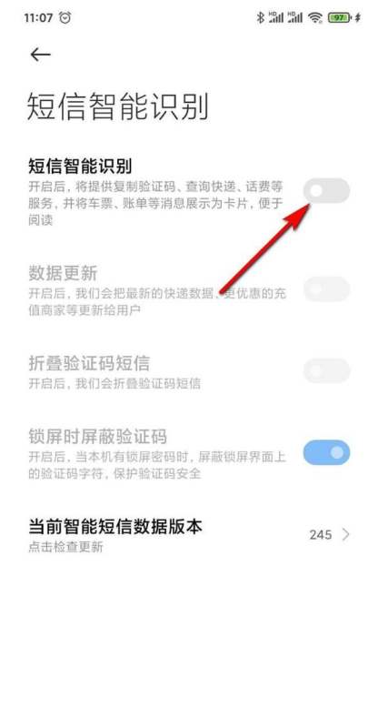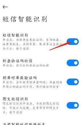 步骤5:开启功能开关点击“短信智能识别”右侧的开关按钮,将其切换至打开状态(显示为蓝色或绿色)。