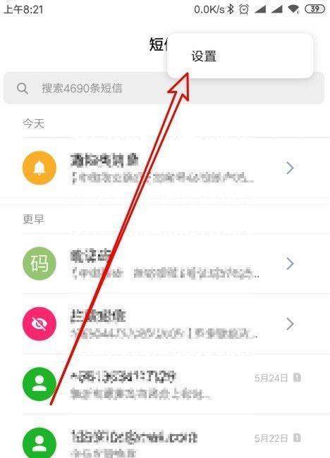 步骤3:打开设置选项在更多菜单中选择“设置”菜单项,进入短信设置页面。