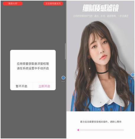 2、打开美颜大师,根据需求开启悬浮窗权限,并安装实时视频美颜插件