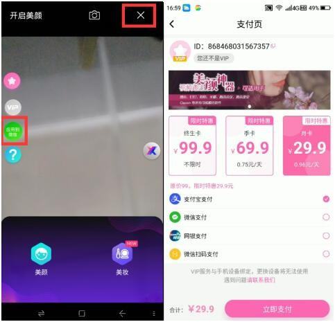 4、设置完美颜效果,点击悬浮窗上应用到微信按钮保存参数,完成会员付费后就可以点右上角关闭设置页面