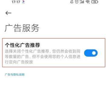 第五步:关闭广告服务开关进入“广告服务”界面后,可见“个性化广告推荐”或“系统广告”开关(部分机型显示为“允许广告推送”)。将右侧开关滑动至关闭状态,系统将停止推送个性化广告内容。
