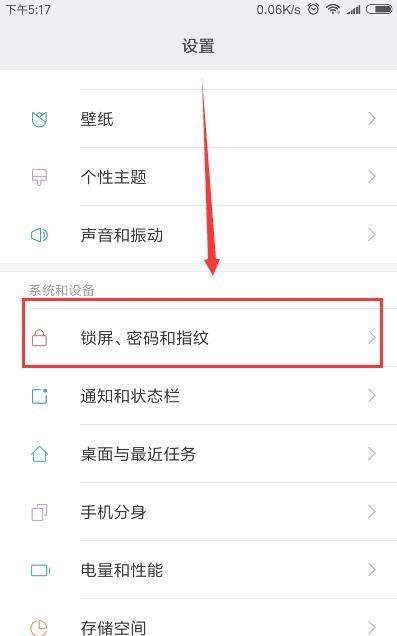在设置功能中找到【系统和设备】下方的【锁屏、密码和指纹】,点击这个选项。