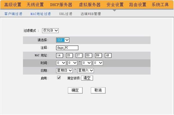 选择仅允许,输入许可的MAC地址并标明注释,点击启用即可使白名单的设备联网访问。