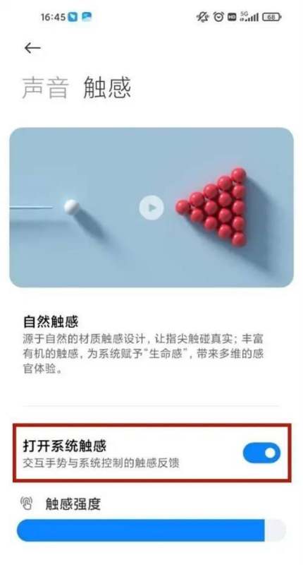 关闭系统触感开关:进入“声音与触感”界面后,向下滑动屏幕,找到“系统触感”选项。可以看到其右侧有一个开关按钮,此时开关应处于开启状态(显示为蓝色或其他亮色)。将该开关向左滑动,使其变为关闭状态(显示为灰色),即可成功关闭小米12X手机的按键震动功能。