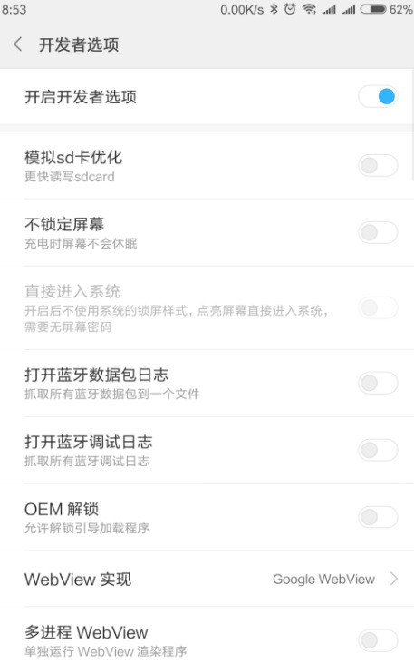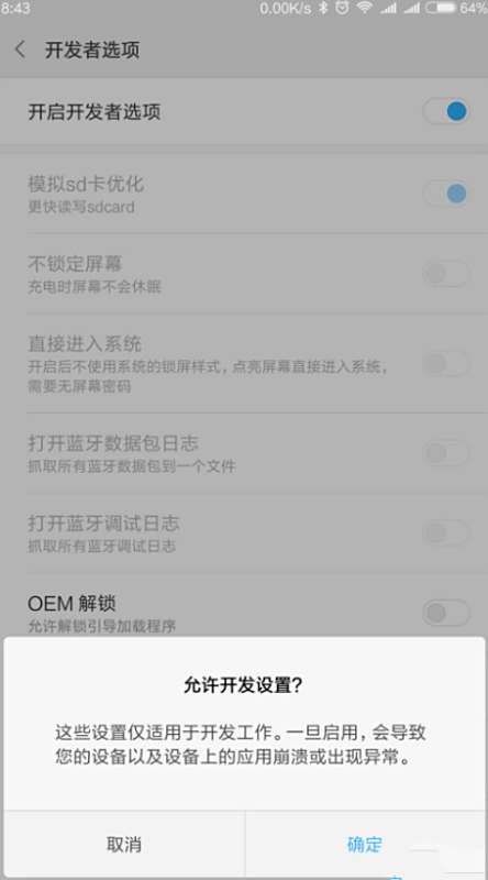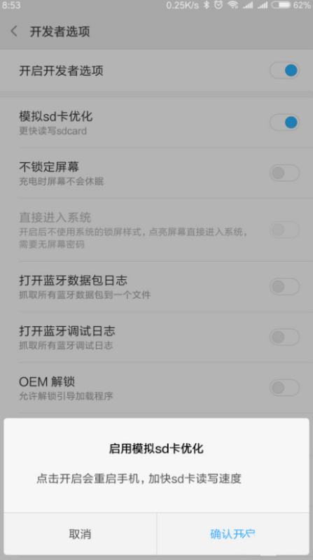 3、然后开发者选项下面还有一个模拟sd卡优化的选项,也要选上,不然还是删不了,点确认开启后手机会重启。