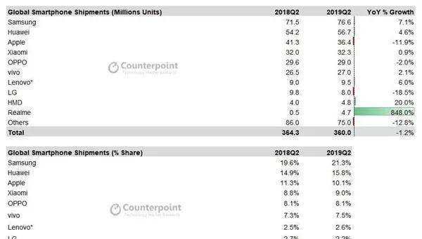 整体市场表现出货量下滑:根据Strategy Analytics数据,2019年第二季度全球智能手机出货量为3.41亿部,同比下降2.6%;Counterpoint Research数据为3.6亿部,同比下降1.2%。两家机构数据差异主要源于统计口径,但均反映市场整体收缩趋势。
