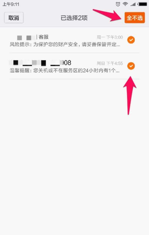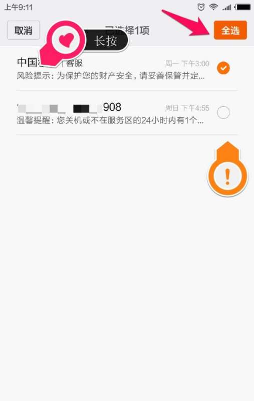 选中目标短信:在短信列表中长按任意一条短信,进入多选模式(短信左侧出现小圆圈)。