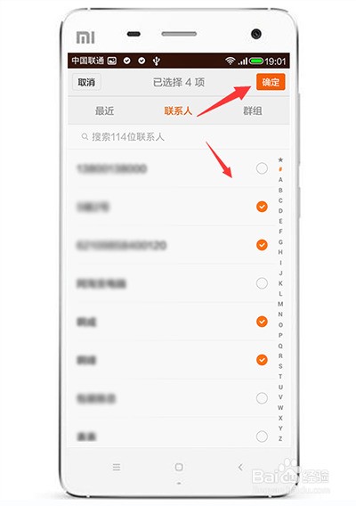 5. 显示手机联系人后,勾选需要导出的联系人、然后在右上方点击确定。