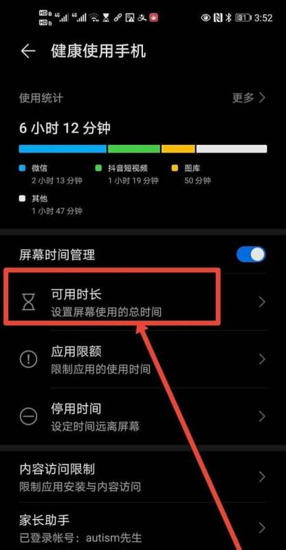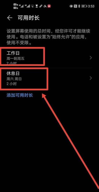 第四步:设置屏幕使用时长点击“可用时长”选项,分别设置周一至周日的每日屏幕使用时间上限,控制整体使用时长。