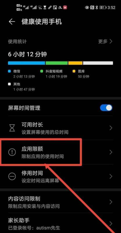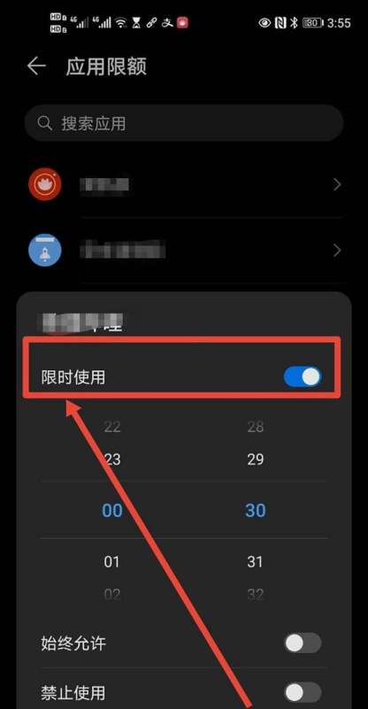 第五步:设置应用使用限额返回上一级菜单,点击“应用限额”功能,选择需要限制的应用(如游戏),设置每日或单次使用时长。