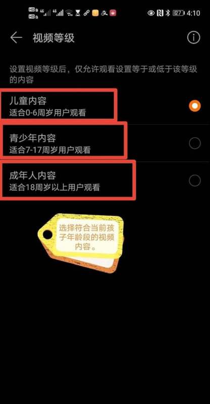 第七步:设置视频内容等级返回上一级菜单,选择“视频等级”功能,根据孩子年龄选择适合的视频内容分级(如儿童、青少年等)。