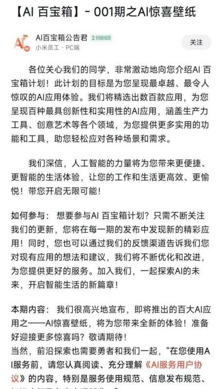 官方未明确是否会单独发布AI百宝箱应用,但暗示其可能成为MIUI系统的重要组成部分。
